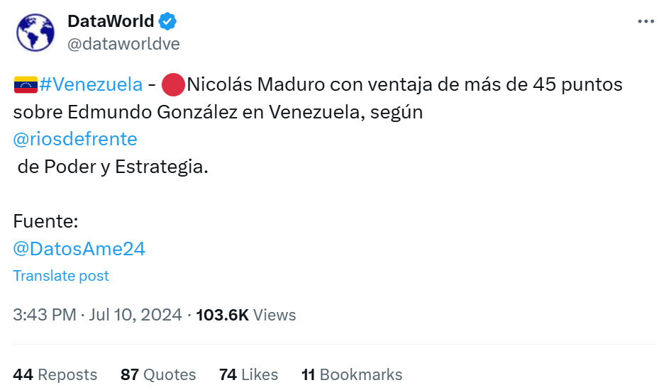 No es la primera vez que desmienten a DataWorld. Hace solo dos días, la cuenta sostuvo que Nicolás Maduro tenía una “ventaja de más de 45 puntos sobre Edmundo González”. Como fuente, citó al presidente de Poder y Estrategia, Ricardo Ríos. Pero tanto la organización como Ríos lo desmintieron.